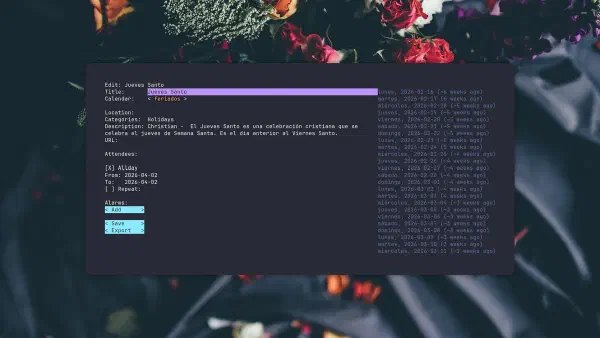 Khal es un programa de calendario basado en la terminal (CLI) para sistemas operativos tipo Unix (Linux, macOS), diseñado para ser ligero, rápido y compatible con estándares iCalendar.